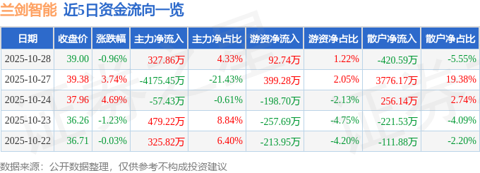 证券之星消息,截至2025年10月28日收盘,兰剑智能(688557)报收于39.0元,下跌0.96%,换手率1.9%,成交量1.95万手,成交额7576.09万元。