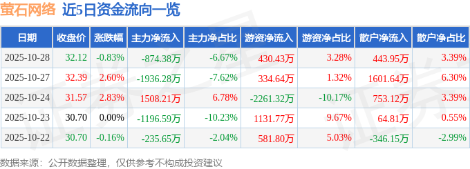 证券之星消息,截至2025年10月28日收盘,萤石网络(688475)报收于32.12元,下跌0.83%,换手率1.0%,成交量4.08万手,成交额1.31亿元。