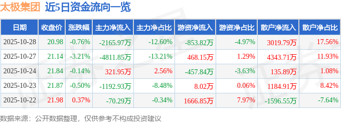证券之星消息,截至2025年10月28日收盘,太极集团(600129)报收于20.98元,下跌0.76%,换手率1.48%,成交量8.18万手,成交额1.72亿元。
