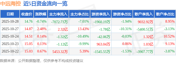证券之星消息,截至2025年10月28日收盘,中远海控(601919)报收于14.76元,下跌0.74%,换手率0.54%,成交量68.09万手,成交额10.09亿元。