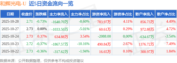 证券之星消息,截至2025年10月28日收盘,和辉光电(688538)报收于2.71元,下跌0.73%,换手率1.22%,成交量70.22万手,成交额1.91亿元。