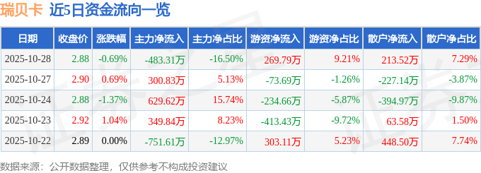 证券之星消息,截至2025年10月28日收盘,瑞贝卡(600439)报收于2.88元,下跌0.69%,换手率0.9%,成交量10.14万手,成交额2929.31万元。