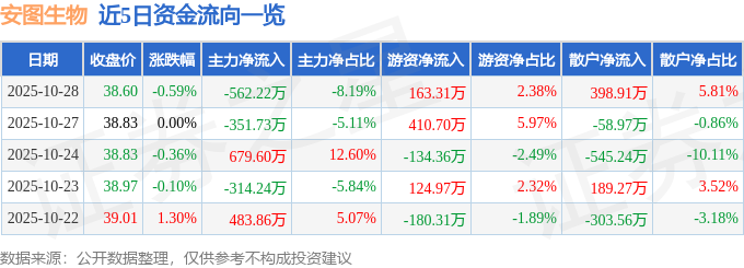 证券之星消息,截至2025年10月28日收盘,安图生物(603658)报收于38.6元,下跌0.59%,换手率0.31%,成交量1.78万手,成交额6867.72万元。