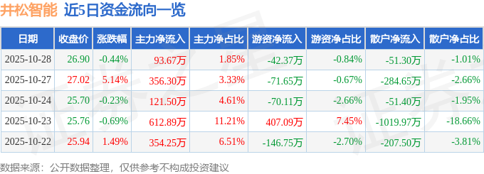 证券之星消息,截至2025年10月28日收盘,井松智能(688251)报收于26.9元,下跌0.44%,换手率3.08%,成交量1.86万手,成交额5063.69万元。