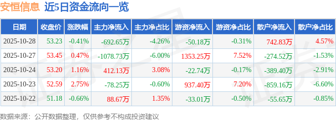 证券之星消息,截至2025年10月28日收盘,安恒信息(688023)报收于53.23元,下跌0.41%,换手率2.95%,成交量3.01万手,成交额1.63亿元。