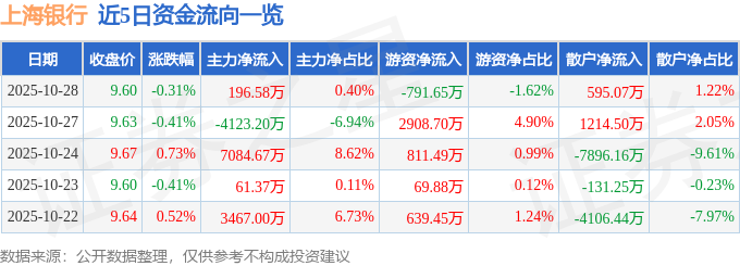 证券之星消息,截至2025年10月28日收盘,上海银行(601229)报收于9.6元,下跌0.31%,换手率0.36%,成交量51.16万手,成交额4.89亿元。
