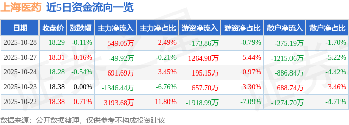 证券之星消息,截至2025年10月28日收盘,上海医药(601607)报收于18.29元,下跌0.11%,换手率0.43%,成交量12.03万手,成交额2.2亿元。