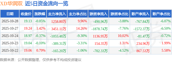 证券之星消息,截至2025年10月28日收盘,XD华润双(600062)报收于19.13元,下跌0.05%,换手率0.64%,成交量6.6万手,成交额1.26亿元。