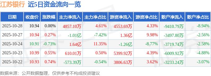 证券之星消息,截至2025年10月28日收盘,江苏银行(600919)报收于10.94元,上涨0.0%,换手率0.53%,成交量96.77万手,成交额10.52亿元。