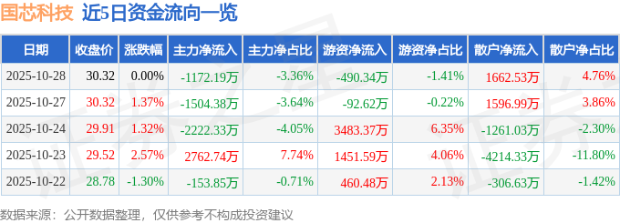 证券之星消息,截至2025年10月28日收盘,国芯科技(688262)报收于30.32元,上涨0.0%,换手率3.42%,成交量11.49万手,成交额3.49亿元。