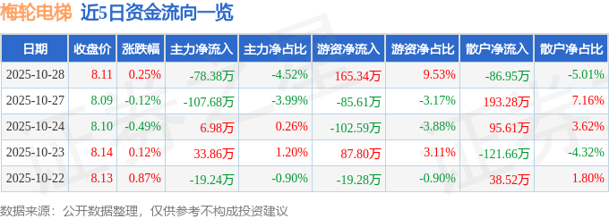证券之星消息,截至2025年10月28日收盘,梅轮电梯(603321)报收于8.11元,上涨0.25%,换手率0.71%,成交量2.14万手,成交额1735.12万元。