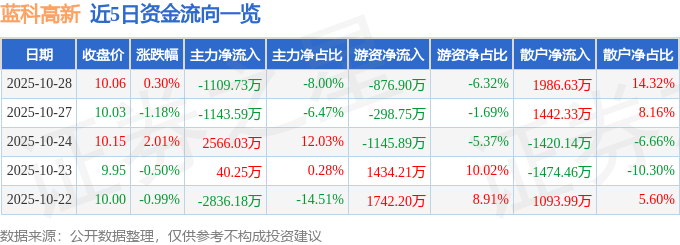 证券之星消息,截至2025年10月28日收盘,蓝科高新(601798)报收于10.06元,上涨0.3%,换手率3.88%,成交量13.76万手,成交额1.39亿元。