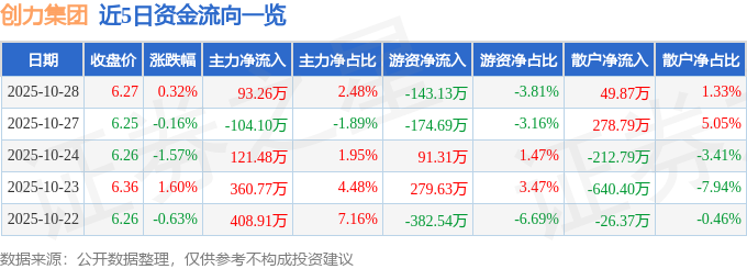 证券之星消息,截至2025年10月28日收盘,创力集团(603012)报收于6.27元,上涨0.32%,换手率0.93%,成交量6.0万手,成交额3756.04万元。