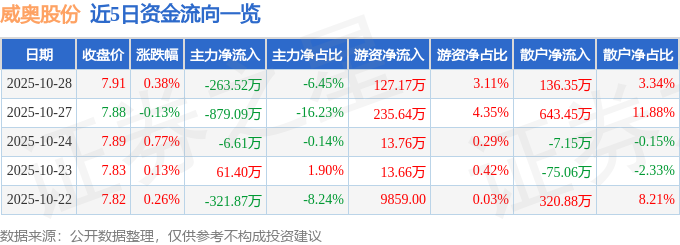 证券之星消息,截至2025年10月28日收盘,威奥股份(605001)报收于7.91元,上涨0.38%,换手率1.32%,成交量5.18万手,成交额4084.86万元。