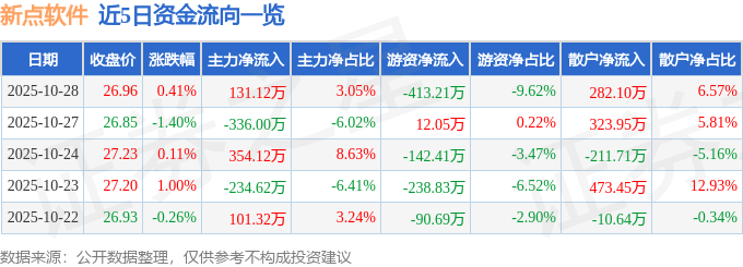 证券之星消息,截至2025年10月28日收盘,新点软件(688232)报收于26.96元,上涨0.41%,换手率0.48%,成交量1.59万手,成交额4296.76万元。