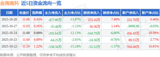 证券之星消息,截至2025年10月28日收盘,金海高科(603311)报收于11.68元,上涨0.43%,换手率1.25%,成交量2.96万手,成交额3446.04万元。