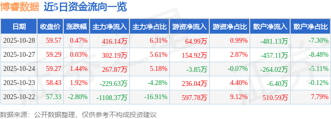 证券之星消息,截至2025年10月28日收盘,博睿数据(688229)报收于59.57元,上涨0.47%,换手率2.47%,成交量1.1万手,成交额6595.01万元。