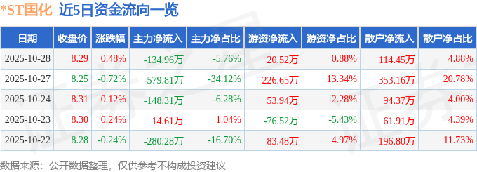 证券之星消息,截至2025年10月28日收盘,*ST国化(600636)报收于8.29元,上涨0.48%,换手率0.64%,成交量2.82万手,成交额2342.89万元。