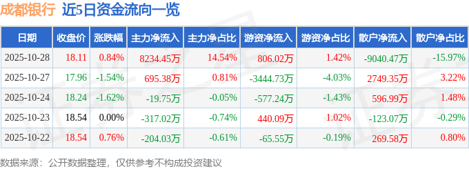 证券之星消息,截至2025年10月28日收盘,成都银行(601838)报收于18.11元,上涨0.84%,换手率0.74%,成交量31.41万手,成交额5.66亿元。