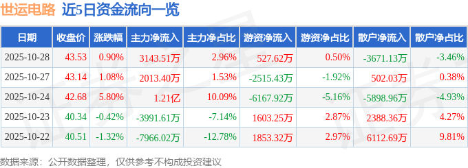证券之星消息,截至2025年10月28日收盘,世运电路(603920)报收于43.53元,上涨0.9%,换手率3.4%,成交量24.48万手,成交额10.62亿元。