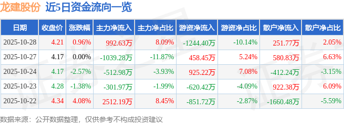 证券之星消息,截至2025年10月28日收盘,龙建股份(600853)报收于4.21元,上涨0.96%,换手率2.88%,成交量29.17万手,成交额1.23亿元。