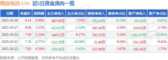 证券之星消息,截至2025年10月28日收盘,精进电动(688280)报收于8.14元,上涨0.99%,换手率2.79%,成交量14.5万手,成交额1.17亿元。