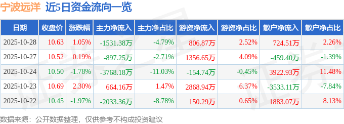 证券之星消息,截至2025年10月28日收盘,宁波远洋(601022)报收于10.63元,上涨1.05%,换手率12.11%,成交量30.11万手,成交额3.2亿元。