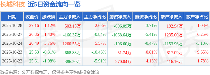 证券之星消息,截至2025年10月28日收盘,长城科技(603897)报收于27.16元,上涨1.12%,换手率3.37%,成交量6.96万手,成交额1.88亿元。