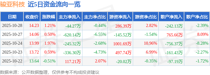 证券之星消息,截至2025年10月28日收盘,骏亚科技(603386)报收于14.23元,上涨1.21%,换手率2.2%,成交量7.18万手,成交额1.02亿元。