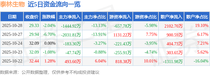 证券之星消息,截至2025年10月28日收盘,泰林生物(300813)报收于29.33元,下跌2.04%,换手率4.93%,成交量3.75万手,成交额1.1亿元。