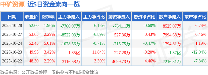证券之星消息,截至2025年10月28日收盘,中矿资源(002738)报收于52.6元,下跌1.96%,换手率3.34%,成交量23.72万手,成交额12.66亿元。
