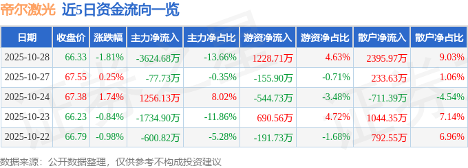 证券之星消息,截至2025年10月28日收盘,帝尔激光(300776)报收于66.33元,下跌1.81%,换手率2.38%,成交量4.0万手,成交额2.65亿元。