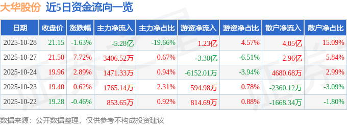 证券之星消息,截至2025年10月28日收盘,大华股份(002236)报收于21.15元,下跌1.63%,换手率5.98%,成交量126.44万手,成交额26.86亿元。