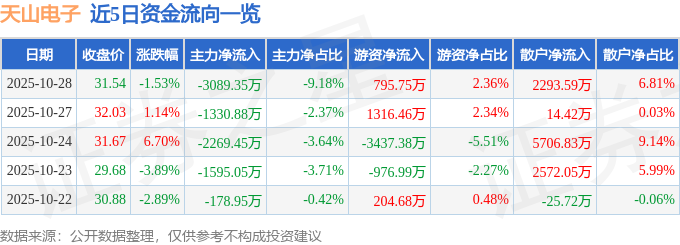 证券之星消息,截至2025年10月28日收盘,天山电子(301379)报收于31.54元,下跌1.53%,换手率8.41%,成交量10.7万手,成交额3.37亿元。