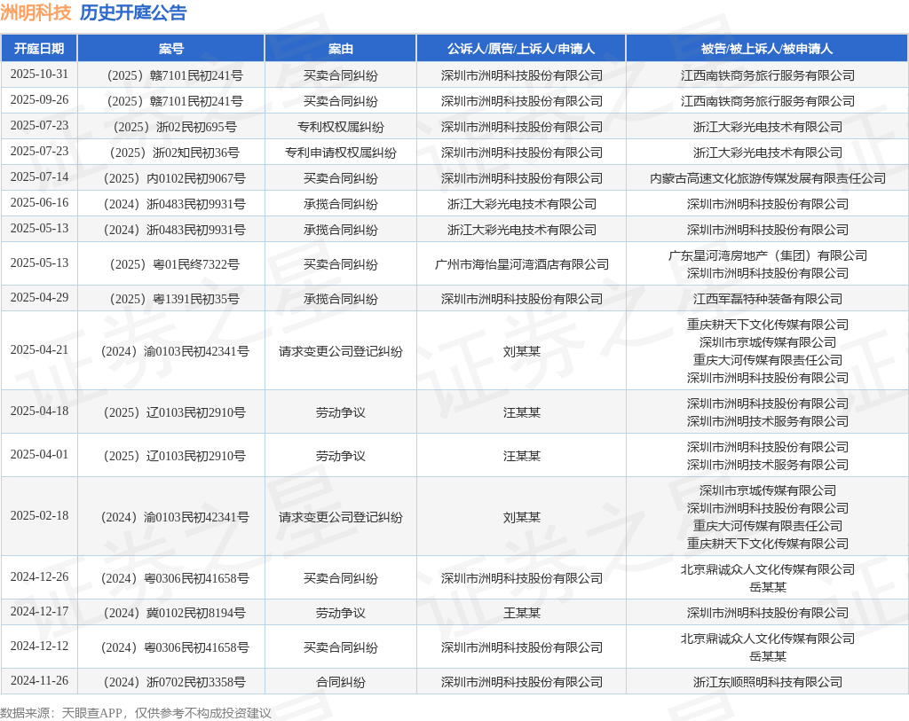 案号:(2025)赣7101民初241号根据统计,近一年内以深圳市洲明科技股份有限公司为当事人的历史开庭公告有17则,其中案由为“买卖合同纠纷”的公告以6则居首,其次为“劳动争议”有3则,“承揽合同纠纷”有3则。历史开庭公告如下: