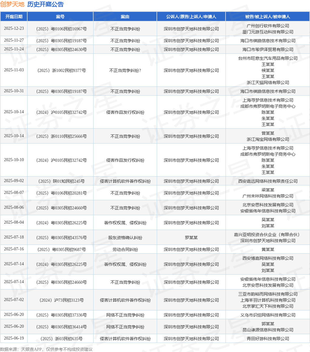 案号:(2025)粤0305民初19187号根据统计,近一年内以深圳市创梦天地科技有限公司为当事人的历史开庭公告有88则,其中案由为“不正当竞争纠纷”的公告以24则居首,其次为“网络不正当竞争纠纷”有22则,“侵害计算机软件著作权纠纷”有12则。历史开庭公告(前20条)如下: