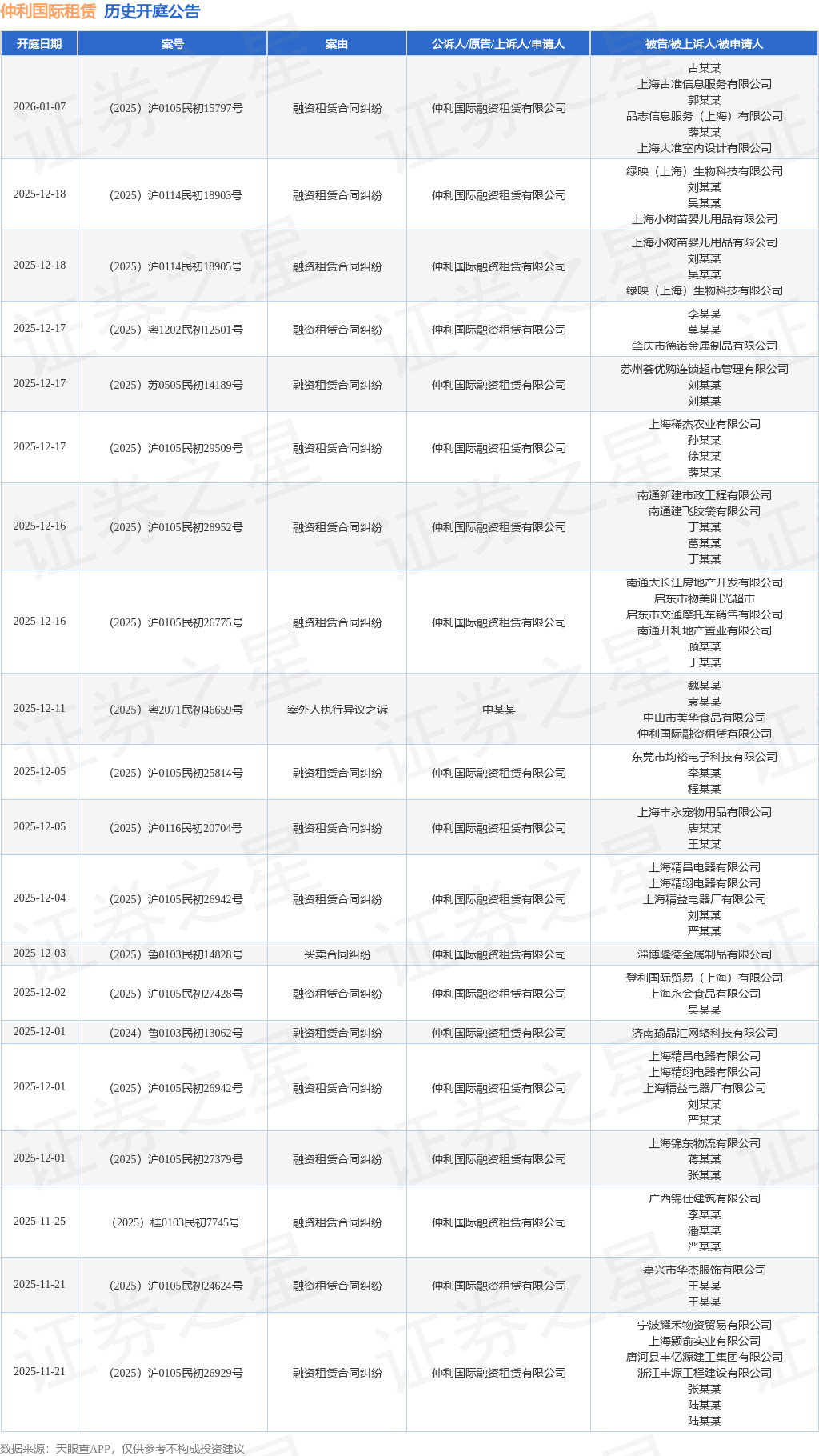 案号:(2025)浙1081民初13912号根据统计,近一年内以仲利国际融资租赁有限公司为当事人的历史开庭公告有1545则,其中案由为“融资租赁合同纠纷”的公告以1358则居首,其次为“租赁合同”有36则,“保证合同纠纷”有28则。历史开庭公告(前20条)如下:
