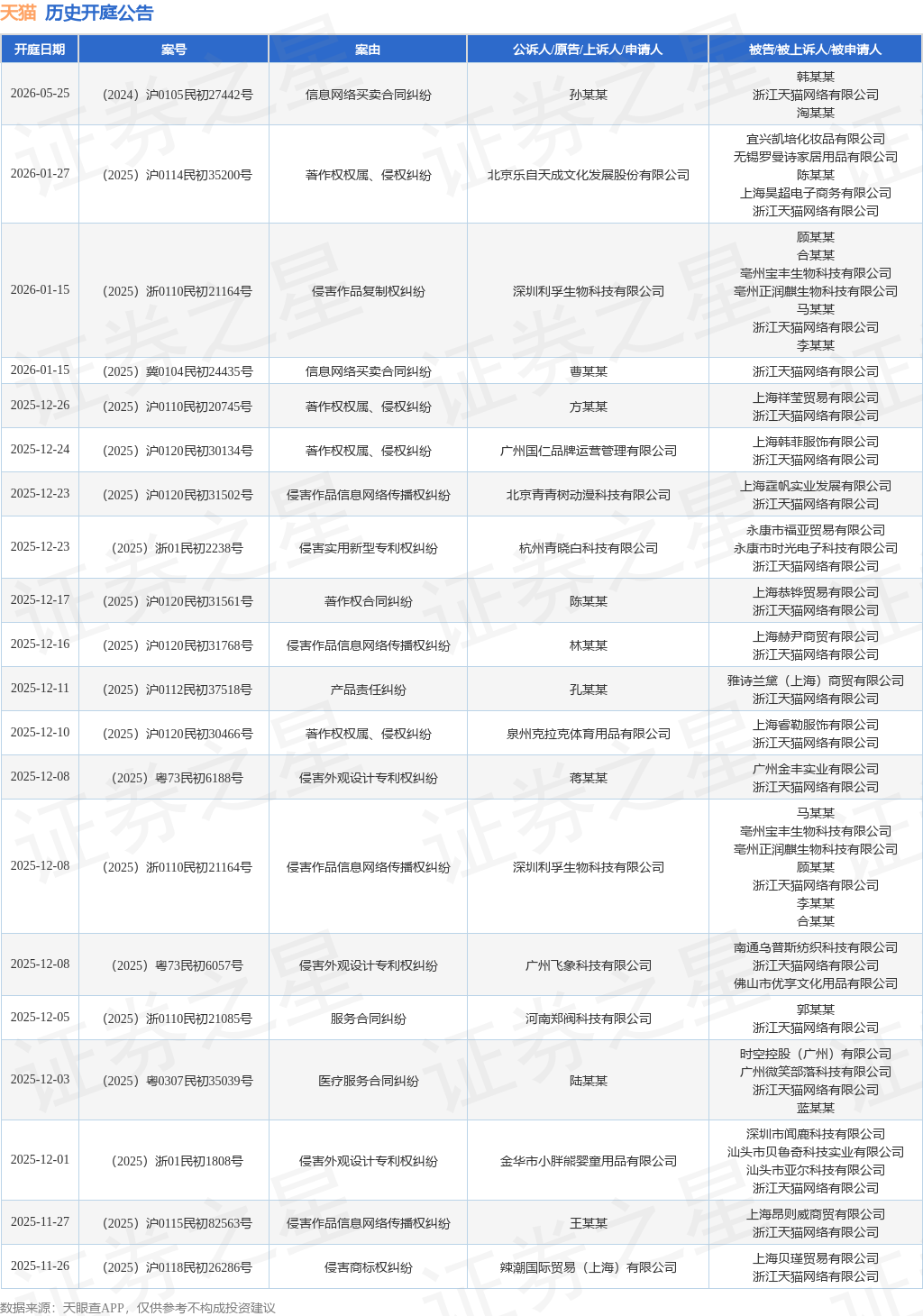 案号:(2025)浙0110民初27008号根据统计,近一年内以浙江天猫网络有限公司为当事人的历史开庭公告有2303则,其中案由为“著作权权属、侵权纠纷”的公告以561则居首,其次为“侵害商标权纠纷”有381则,“侵害外观设计专利权纠纷”有352则。历史开庭公告(前20条)如下: