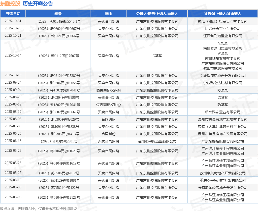 案号:(2025)闽0104民初5545-1号根据统计,近一年内以广东东鹏控股股份有限公司为当事人的历史开庭公告有80则,其中案由为“买卖合同纠纷”的公告以65则居首,其次为“合同纠纷”有6则,“侵害商标权纠纷”有5则。历史开庭公告(前20条)如下: