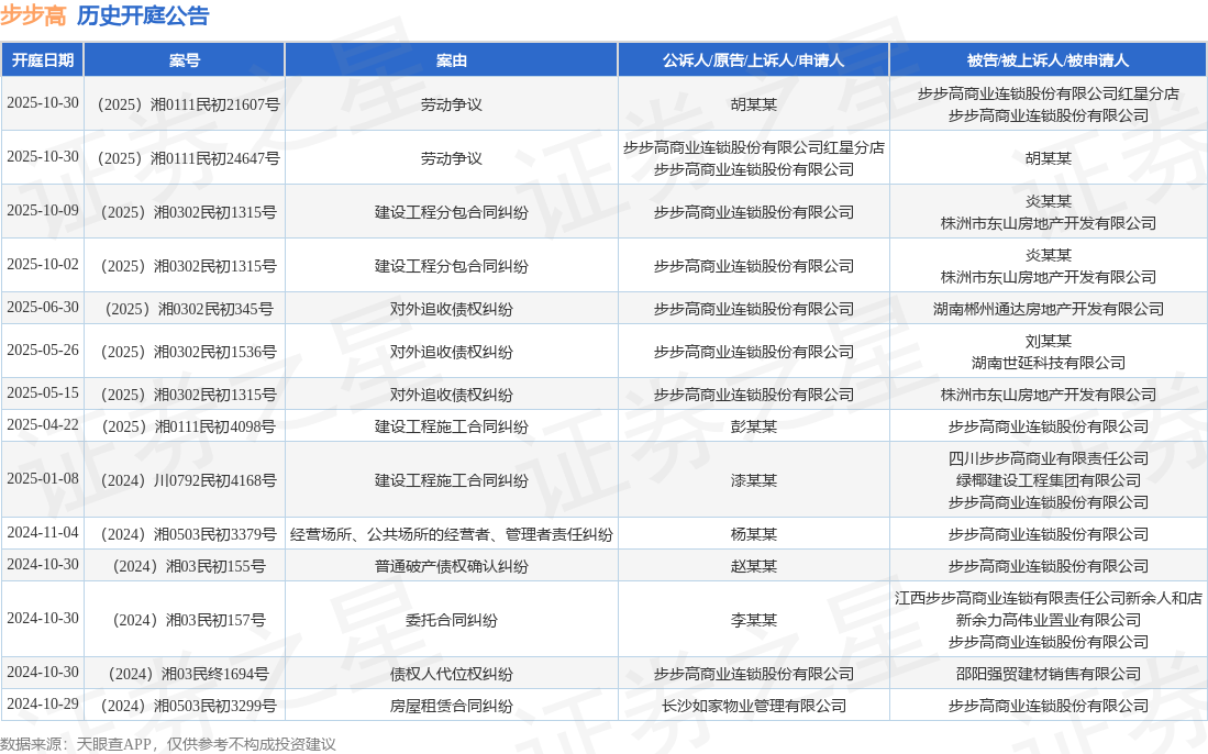 案号:(2025)湘0111民初21607号根据统计,近一年内以步步高商业连锁股份有限公司为当事人的历史开庭公告有14则,其中案由为“对外追收债权纠纷”的公告以3则居首,其次为“劳动争议”有2则,“建设工程分包合同纠纷”有2则。历史开庭公告如下: