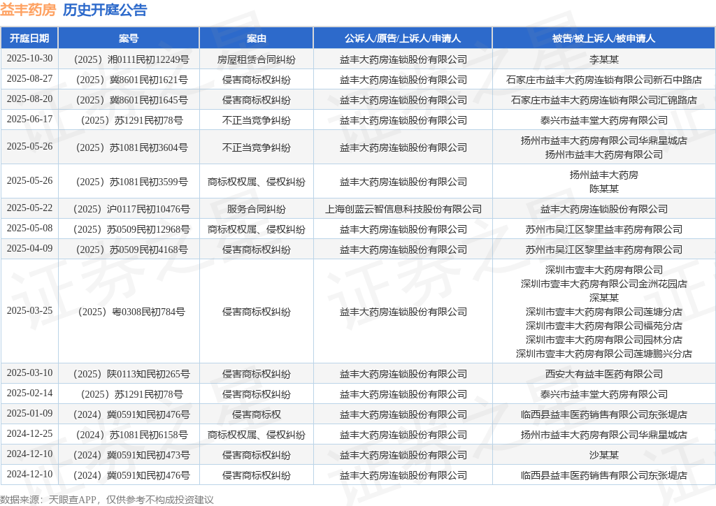 案号:(2025)湘0111民初12249号根据统计,近一年内以益丰大药房连锁股份有限公司为当事人的历史开庭公告有16则,其中案由为“侵害商标权纠纷”的公告以8则居首,其次为“商标权权属、侵权纠纷”有3则,“不正当竞争纠纷”有2则。历史开庭公告如下: