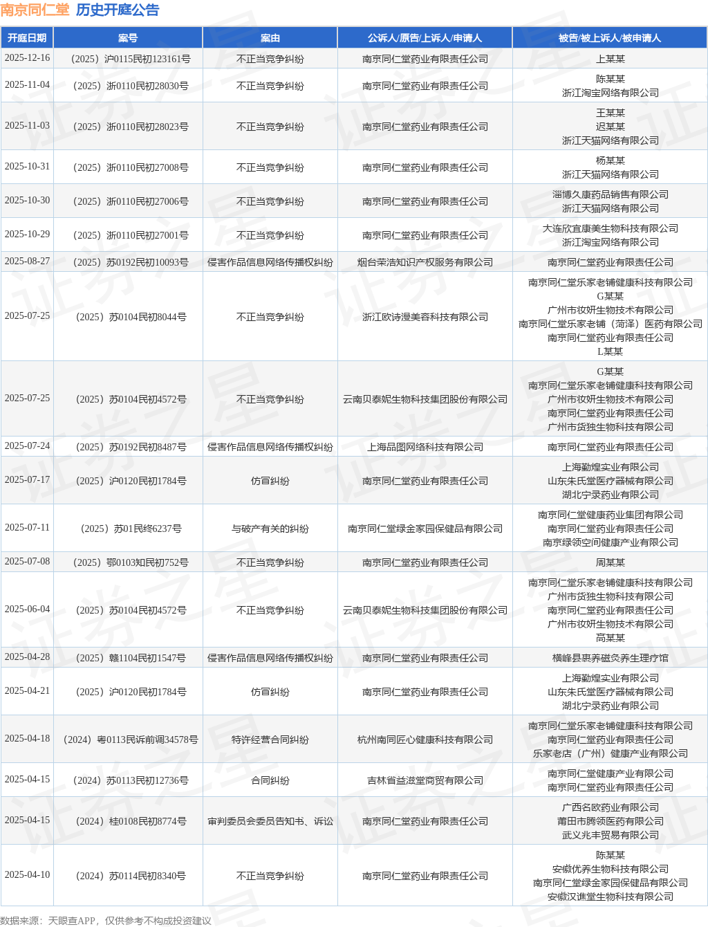 案号:(2025)浙0110民初27008号根据统计,近一年内以南京同仁堂药业有限责任公司为当事人的历史开庭公告有44则,其中案由为“不正当竞争纠纷”的公告以22则居首,其次为“侵害商标权纠纷”有5则,“与破产有关的纠纷”有3则。历史开庭公告(前20条)如下: