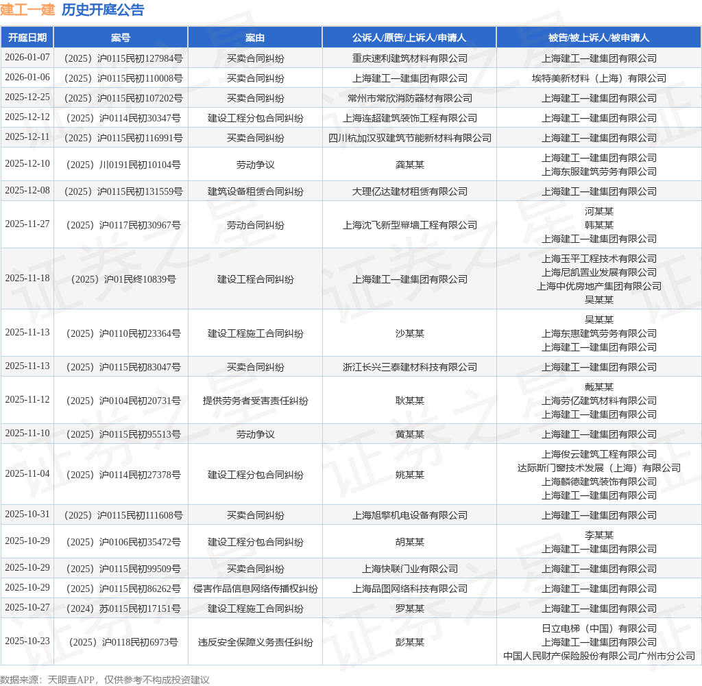 案号:(2025)沪0115民初111608号根据统计,近一年内以上海建工一建集团有限公司为当事人的历史开庭公告有343则,其中案由为“买卖合同纠纷”的公告以93则居首,其次为“建设工程施工合同纠纷”有46则,“建设工程分包合同纠纷”有42则。历史开庭公告(前20条)如下: