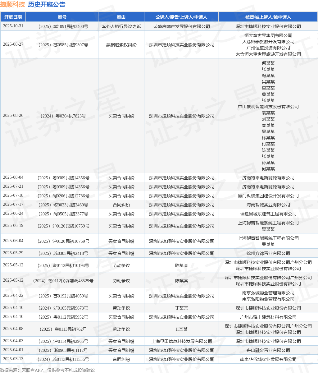 案号:(2025)冀1091民初3400号根据统计,近一年内以深圳市捷顺科技实业股份有限公司为当事人的历史开庭公告有39则,其中案由为“买卖合同纠纷”的公告以24则居首,其次为“劳动争议”有7则,“合同纠纷”有3则。历史开庭公告(前20条)如下: