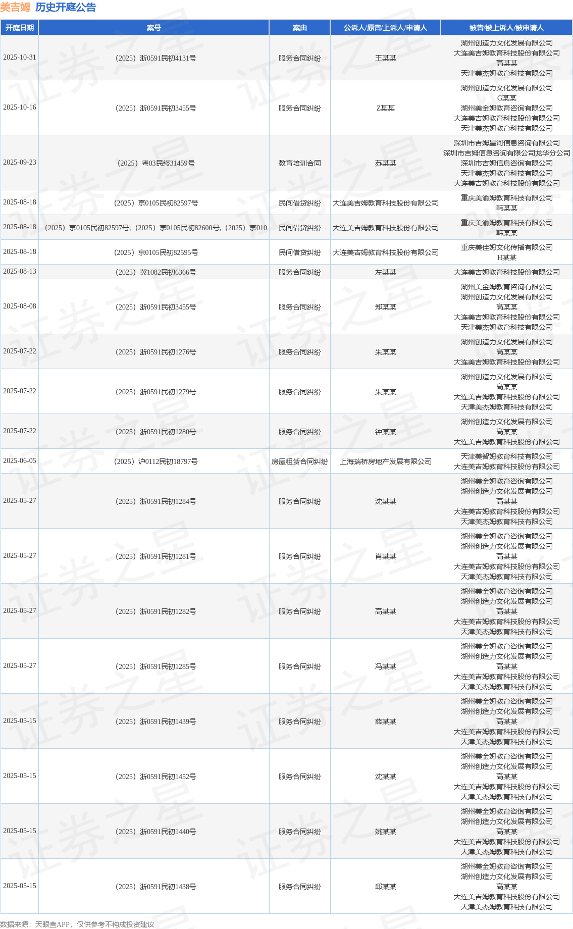 案号:(2025)浙0591民初4131号根据统计,近一年内以大连美吉姆教育科技股份有限公司为当事人的历史开庭公告有62则,其中案由为“服务合同纠纷”的公告以45则居首,其次为“教育培训合同纠纷”有11则,“民间借贷纠纷”有3则。历史开庭公告(前20条)如下: