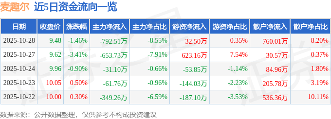 证券之星消息,截至2025年10月28日收盘,麦趣尔(002719)报收于9.48元,下跌1.46%,换手率6.04%,成交量9.77万手,成交额9265.36万元。