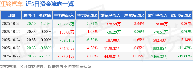 证券之星消息,截至2025年10月28日收盘,江铃汽车(000550)报收于20.1元,下跌1.23%,换手率1.05%,成交量5.46万手,成交额1.1亿元。