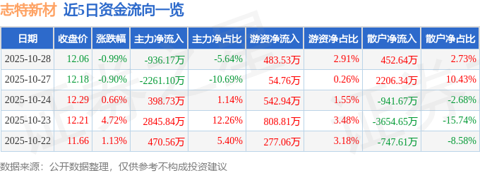 证券之星消息,截至2025年10月28日收盘,志特新材(300986)报收于12.06元,下跌0.99%,换手率3.31%,成交量13.62万手,成交额1.66亿元。