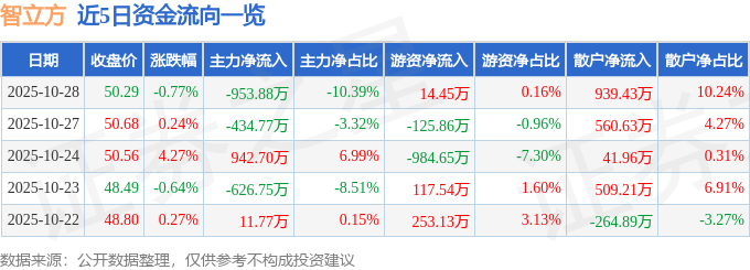 证券之星消息,截至2025年10月28日收盘,智立方(301312)报收于50.29元,下跌0.77%,换手率3.0%,成交量1.82万手,成交额9178.32万元。