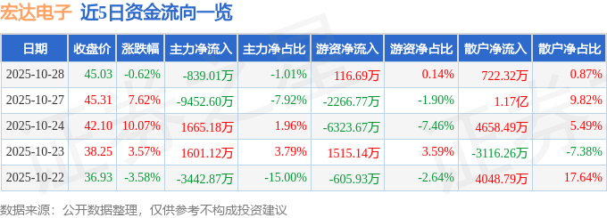 证券之星消息,截至2025年10月28日收盘,宏达电子(300726)报收于45.03元,下跌0.62%,换手率8.61%,成交量18.46万手,成交额8.3亿元。